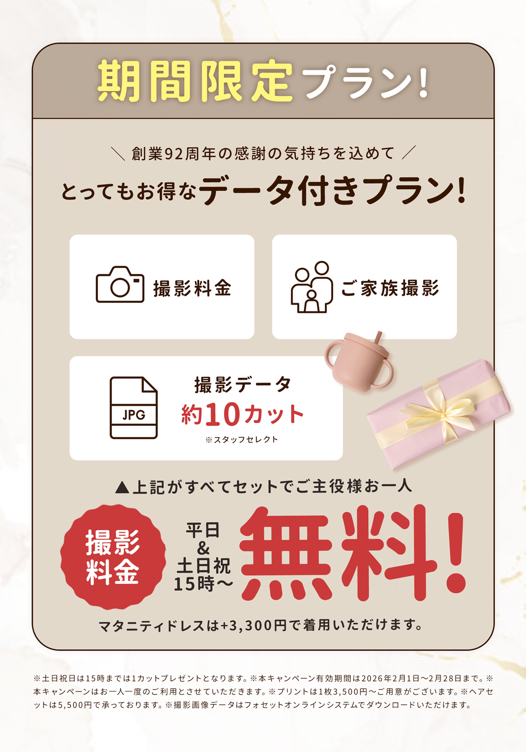 もちろんご家族全員での撮影も可能でございます。お子様がいる場合は、衣装(別途料金)も着用することが出来ますのでご予約時にお申し付けくださいませ。